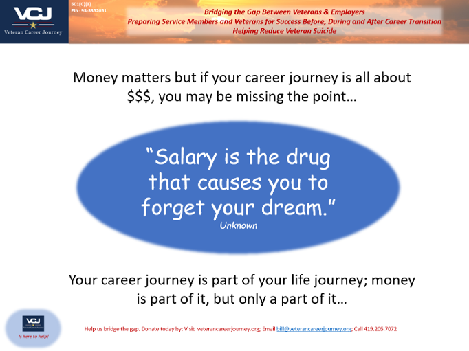 But money is only part of the “total compensation” picture. As you consider your new career, pay attention to the ‘rest of the story’…purpose, culture, quality of life, geography, and so forth…you’ll be glad you did!